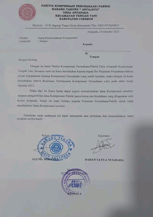 Investigasi.co.id – Cirebon 24 Oktober 2025. Gelombang pertanyaan dan kritik muncul terkait beredarnya surat resmi berkop Panitia Kompensasi Perusahaan/Pabrik Karang Taruna “Astajaya” Desa Astapada, Kecamatan Tengah Tani, Kabupaten Cirebon, yang tertanggal 20 Oktober 2025.