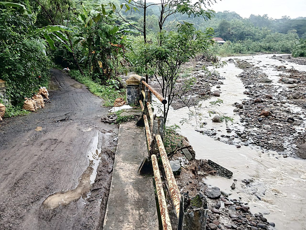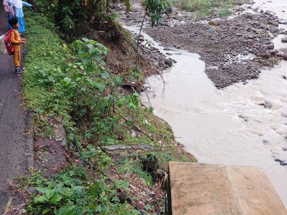 Pantauan di lokasi menunjukkan railing jembatan mengalami kerusakan parah hingga terlepas. Selain itu, senderan atau penahan tepi sungai juga ikut ambles akibat tergerus arus air yang cukup kuat. Kerusakan paling mengkhawatirkan terlihat pada bagian pondasi bawah jembatan yang sudah hampir terputus. Kondisi ini sangat berisiko, terutama apabila jembatan dilintasi kendaraan roda empat yang dapat memicu ambrolnya seluruh konstruksi jembatan sewaktu-waktu.