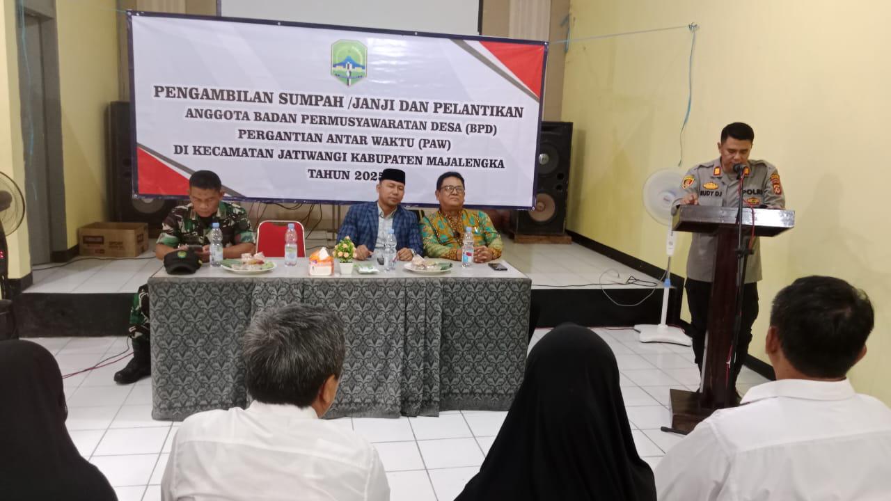 Dalam sambutannya, Kapolsek Jatiwangi AKP Rudy Djunardi menyampaikan harapan agar anggota BPD yang baru dapat menjalankan tugas dengan penuh tanggung jawab, serta menjalin sinergi yang baik dengan pemerintah desa dan masyarakat.